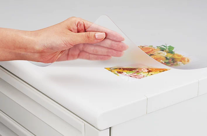 水や液体をこぼしてもサッと拭くだけでOKな耐水性、温かい飲み物が入ったカップなどを置いても熱で変化しない耐熱性、さらに傷が付きにくい耐久性も備えています。子どもの学習机用、ランチョンマット的に使うなど、幅広く利用できるのがポイントです。
